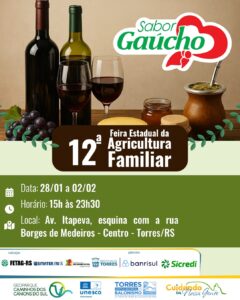 Entre os dias 28 de janeiro e 2 de fevereiro, o município de Torres será palco da 12ª Feira Estadual da Agricultura Familiar – Feira Sabor Gaúcho, um evento que valoriza a produção local e fortalece os agricultores familiares do Rio Grande do Sul.