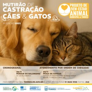 A Prefeitura de Torres, por meio da Secretaria de Meio Ambiente e Urbanismo, anuncia a 3ª edição do Mutirão de Castração de Cães e Gatos, que acontecerá nos dias 08 de novembro (sábado), no Parque do Balonismo, e 09 de novembro (domingo), na Associação dos Moradores da Praia de Itapeva. Os horários seguem sendo: cães a partir das 8h e gatos a partir das 13h, ao todo serão 200 vagas.