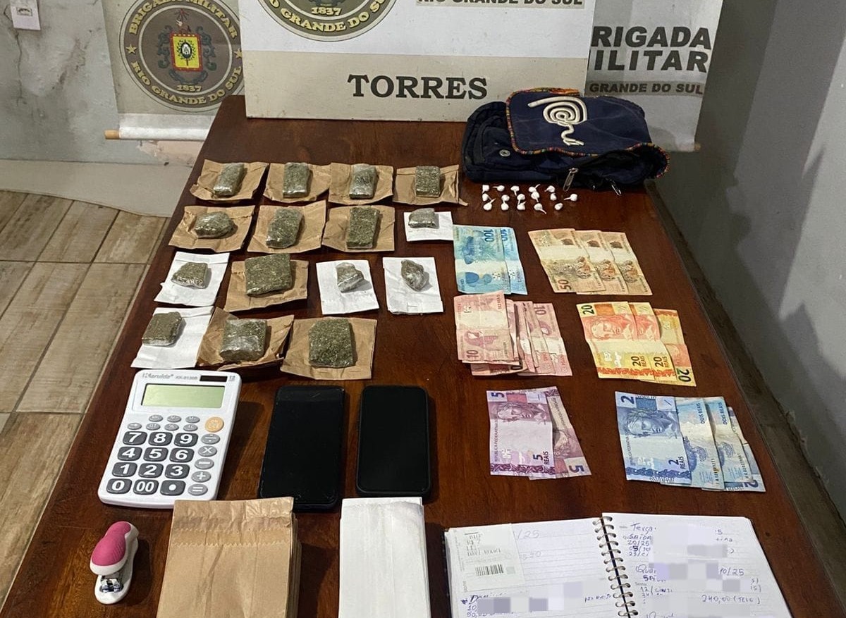 Durante operação integrada Fronteiras e Divisas Seguras em Torres, após fuga durante uma tentativa de abordagem policial, uma guarnição abordou um veículo Renault Sandero. Na ocasião, prendeu um homem de 28 anos e uma mulher de 47 anos. No interior do automóvel foram encontradas 15 porções de maconha e 16 cocaína já fracionadas para venda, além de dinheiro, celulares e um caderno de anotações do tráfico.