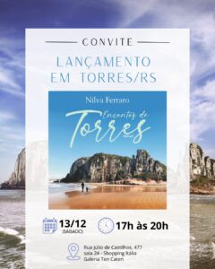 Neste sábado, 13 de dezembro, das 17 às 20 horas, a escritora e poeta Nilva Ferraro lança “Encantos de Torres”, seu novo livro de haikais. Trata-se de uma homenagem à beleza natural e histórica de Torres, que a autora frequenta há décadas. O livro é também uma expressão da gratidão que Nilva sente por este lugar que sempre a acolheu.