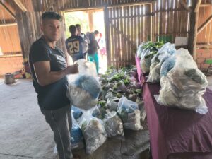 A “cesta verde” é composta por produtos adquiridos diretamente dos oito agricultores familiares cadastrados na proposta, tais como: alface, aipim, banana, batata doce, tomate, tempero verde, repolho, rúcula, pão e bolo caseiros. Nesta entrega, foram adquiridos 562 kg de alimentos, gerando uma renda de R$ 4.612,51 aos agricultores familiares.